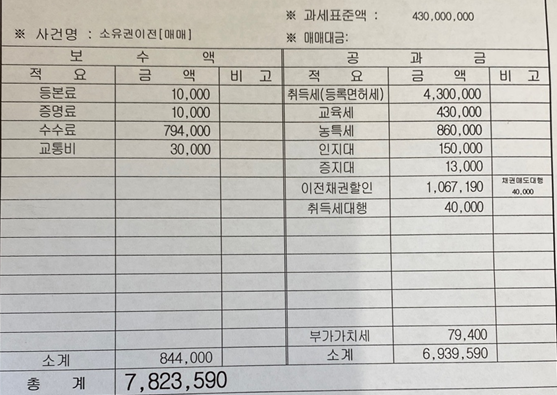 그리고 수수료 79만 4000 외에도 등본료 1만, 증명료 1만, 교통비 3만 취득세 대행 4만 그리고 채권 매도대행?? 이걸로 또 4만을 가져가서 11만을 추가로 가져갔더군요